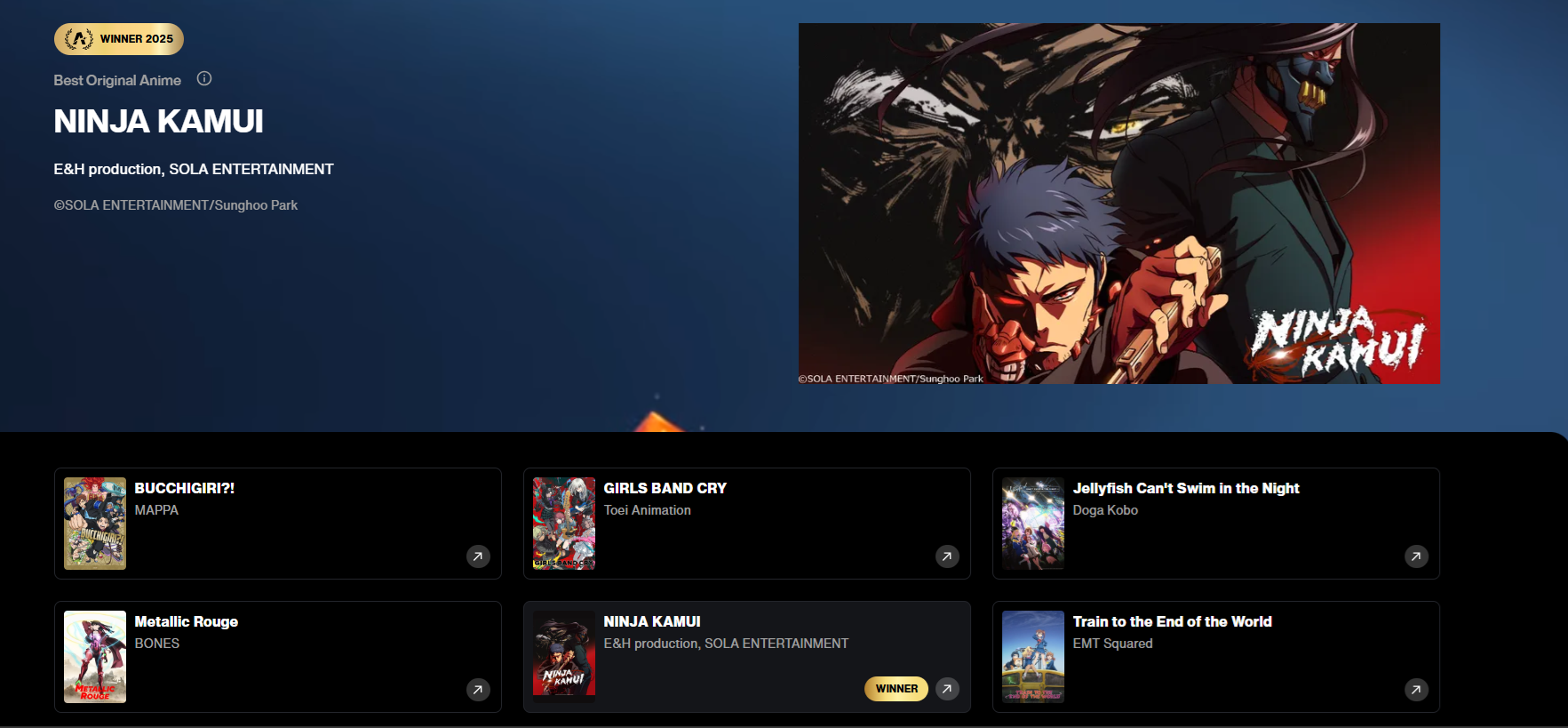 On Sunday, May 25, Crunchyroll presented its annual Anime Awards. As part of the voting process, 6 animes were chosen for each category. Voting was opened to fans in April, and the winners were announced this past Sunday. Ninja Kamui was one of the anime chosen for Best Original Anime and this year came out on top. The other nominees included Girls Band Cry, Jellyfish Can’t Swim in the Night, Bucchigiri?!, Metallic Rouge, and Train to the End of the World.